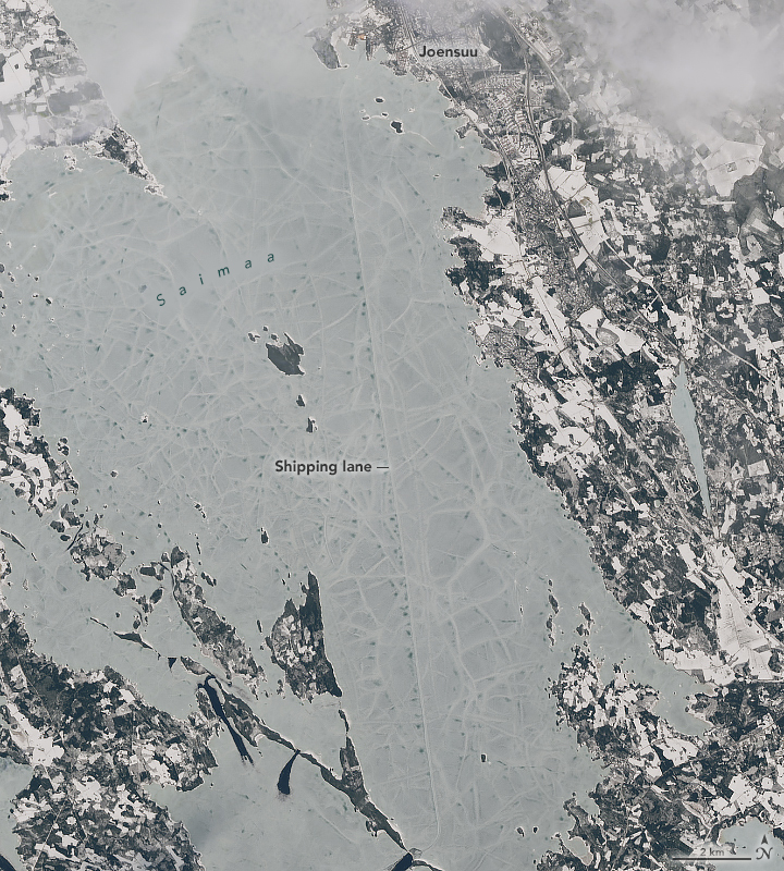 NASAの地球観測衛星Landsat 8が撮影したフィンランドのサイマー湖です。4月に入り、融氷が進み始めています。
