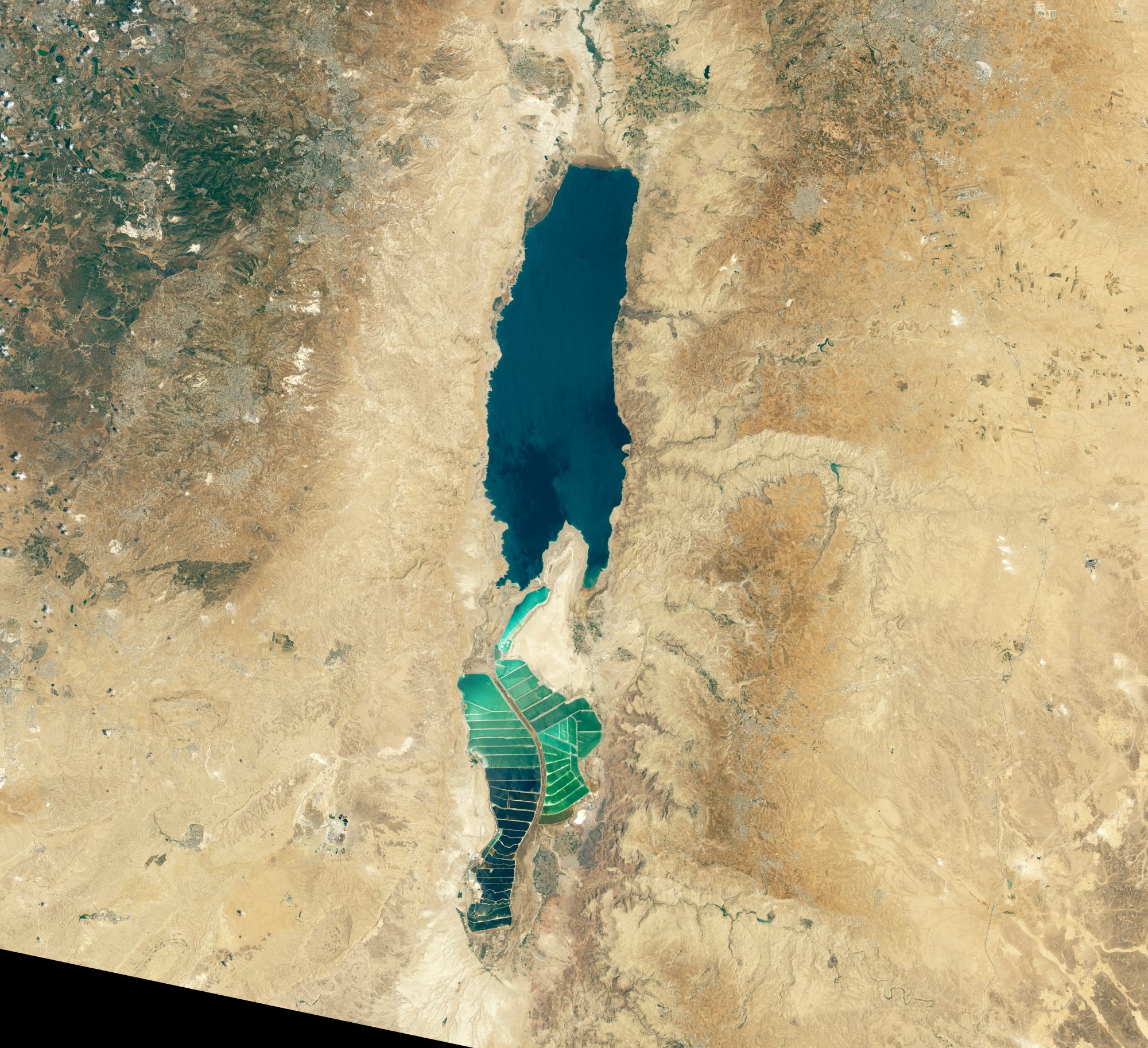 [:ja]NASAの地球観測衛星Landsat 8が撮影した中東の死海です。西側をイスラエル、東側をヨルダンに接し、湖面の海抜はマイナス418mと、地表で最も低い場所です。