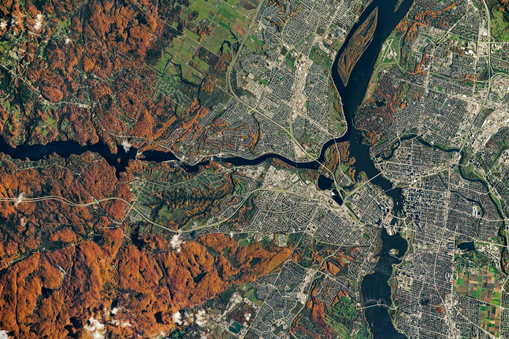 Astronaut on board ISS captured Ottawa, the capital of Canada where reddening of the fall just started. West of downtown Ottawa lies Gatineau Park, where sugar maple leaves turn orange-red and hickories turn golden-bronze during the season.