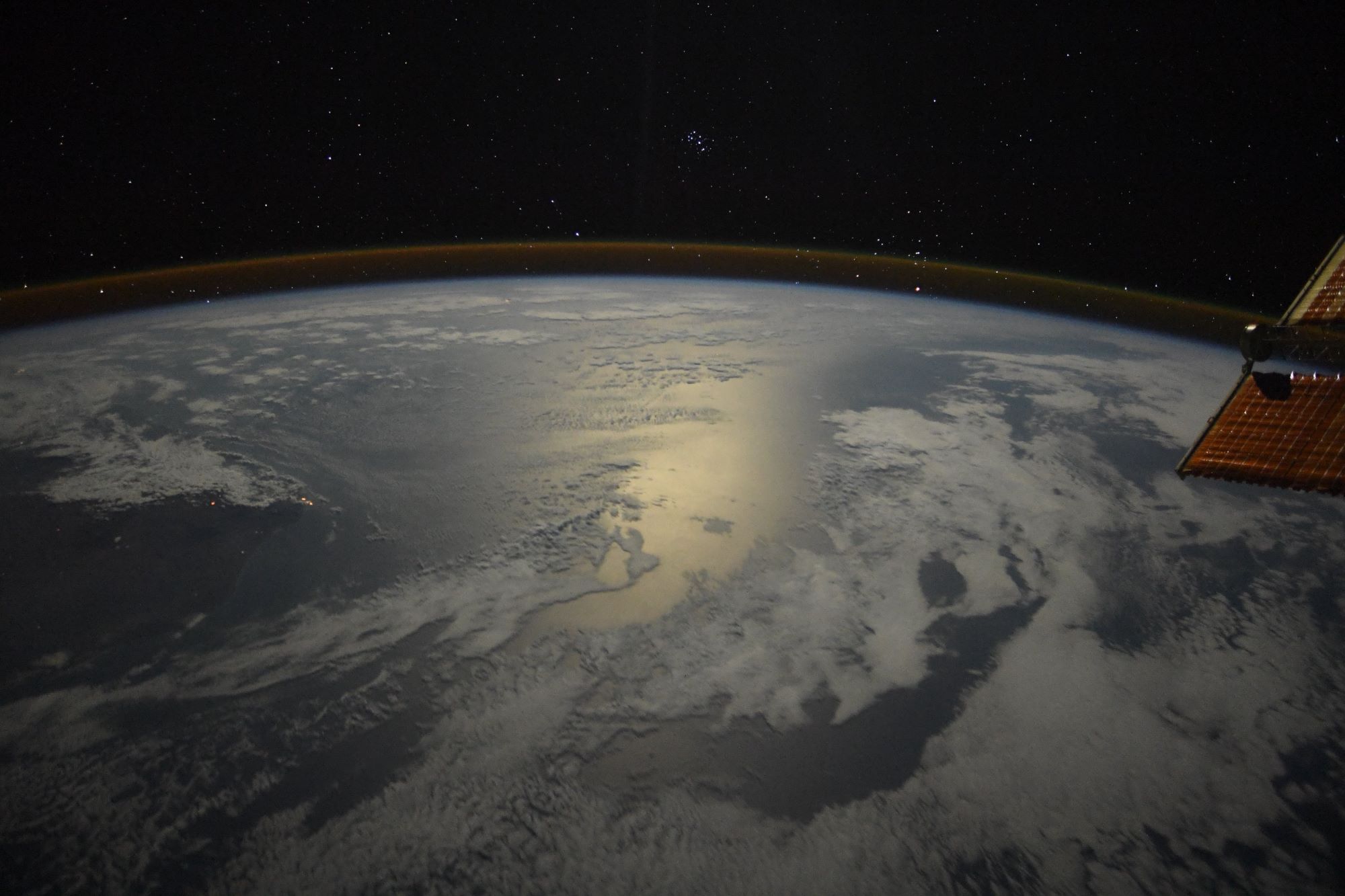 Astronaut Shane Kimbrough captured from ISS beautiful night Earth and the sunglint. Sunglint is a phenomenon that occurs when sunlight reflects off the surface of the ocean at the same angle that a satellite or other sensor is viewing the surface.