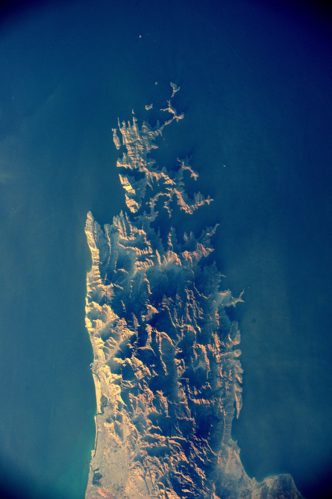 Astronaut Thomas Pesquet captured the dusk of theHormuz Strait off the coast of Oman🇴🇲. The satellite image is the exclave of Oman to the south of which United Arab Emirates (UAE) lies. The strait has 75-100m depth and 54km width at its narrowest.