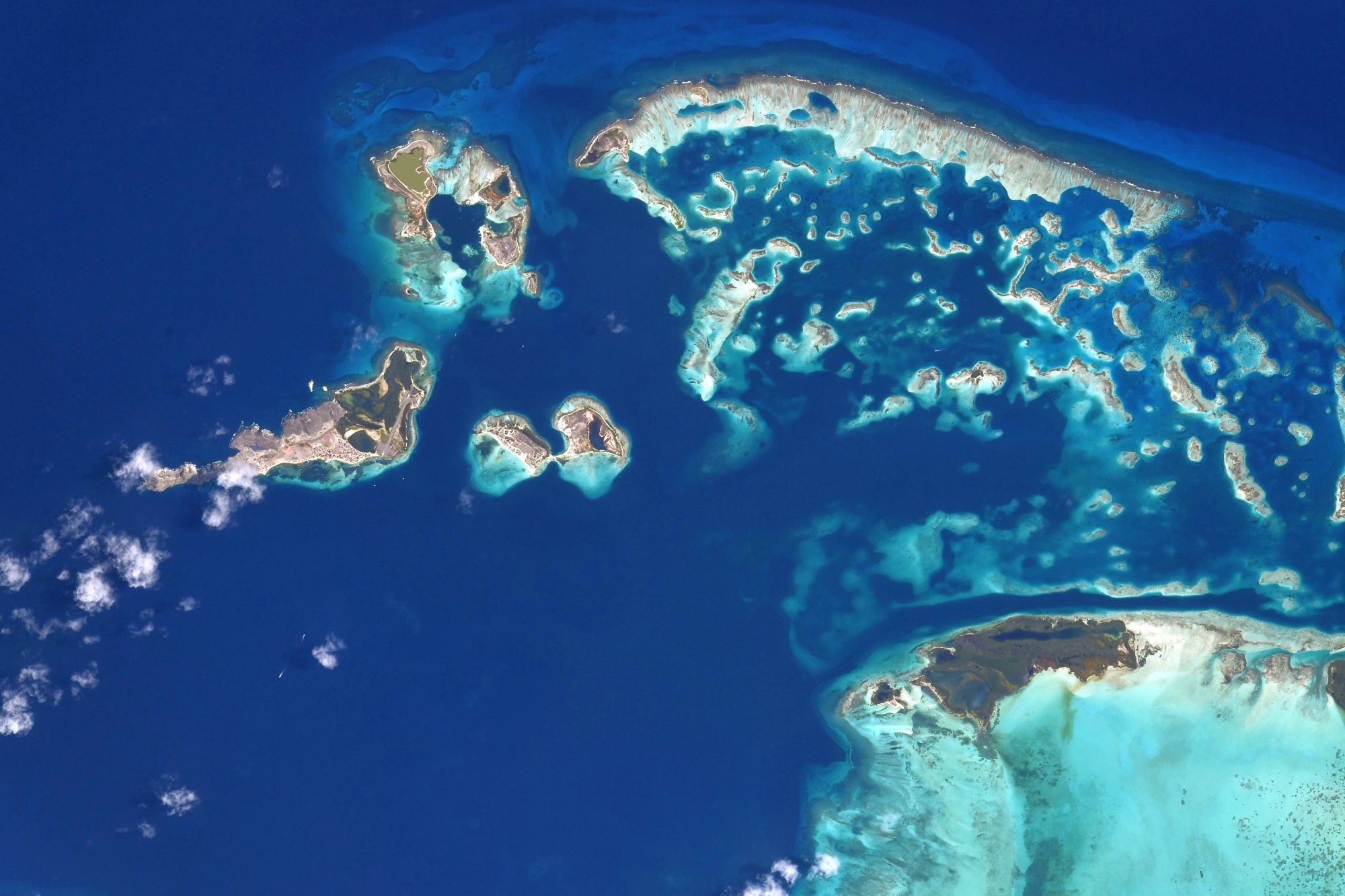 Gran Roque is an island, one of the federal dependencies of Venezuela, located in the southeastern Caribbean Sea in the archipelago of Los Roques, which has 1.7km2 in extent, where the majority of the population lives. Gran Roque already appears in Spanish maps as part of the general captaincy of Venezuela, during the government of Antonio Guzman Blanco was included in the so-called Colón Territory. In the twentieth century is included in the Federal dependencies and in the decade of 1990 becomes the seat of the authority of Area that would disappear to be replaced by the Insular Territory Miranda in 2011. The island is directly administered by the central government through the figure of the island Territory, created in 2011. (Credit: Shane Kimbrough, NASA)