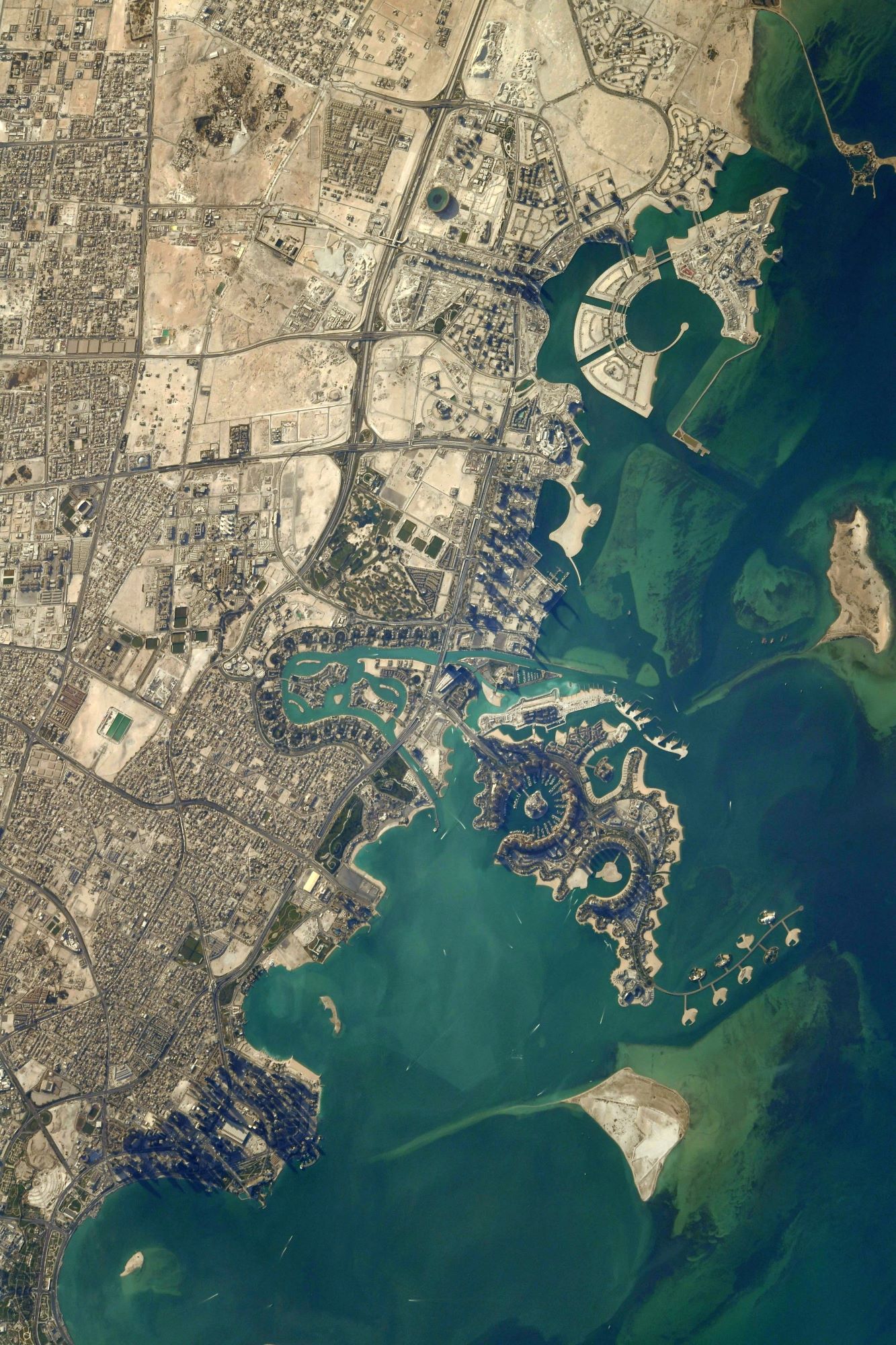 Qatar’s sole land border is with neighbouring Saudi Arabia to the south, with the rest of its territory surrounded by the Persian Gulf. The discovery of oil in 1940 completely transformed the state’s economy, and now the country has a high standard of living for its legal citizens. With no income tax, Qatar is one of the countries with the lowest tax rates in the world, and the unemployment rate in June 2013 was 0.1%. Doha is the commercial capital of Qatar and one of the emergent financial centers in the Middle East. (Credit: Thomas Pesquet, ESA, NASA)