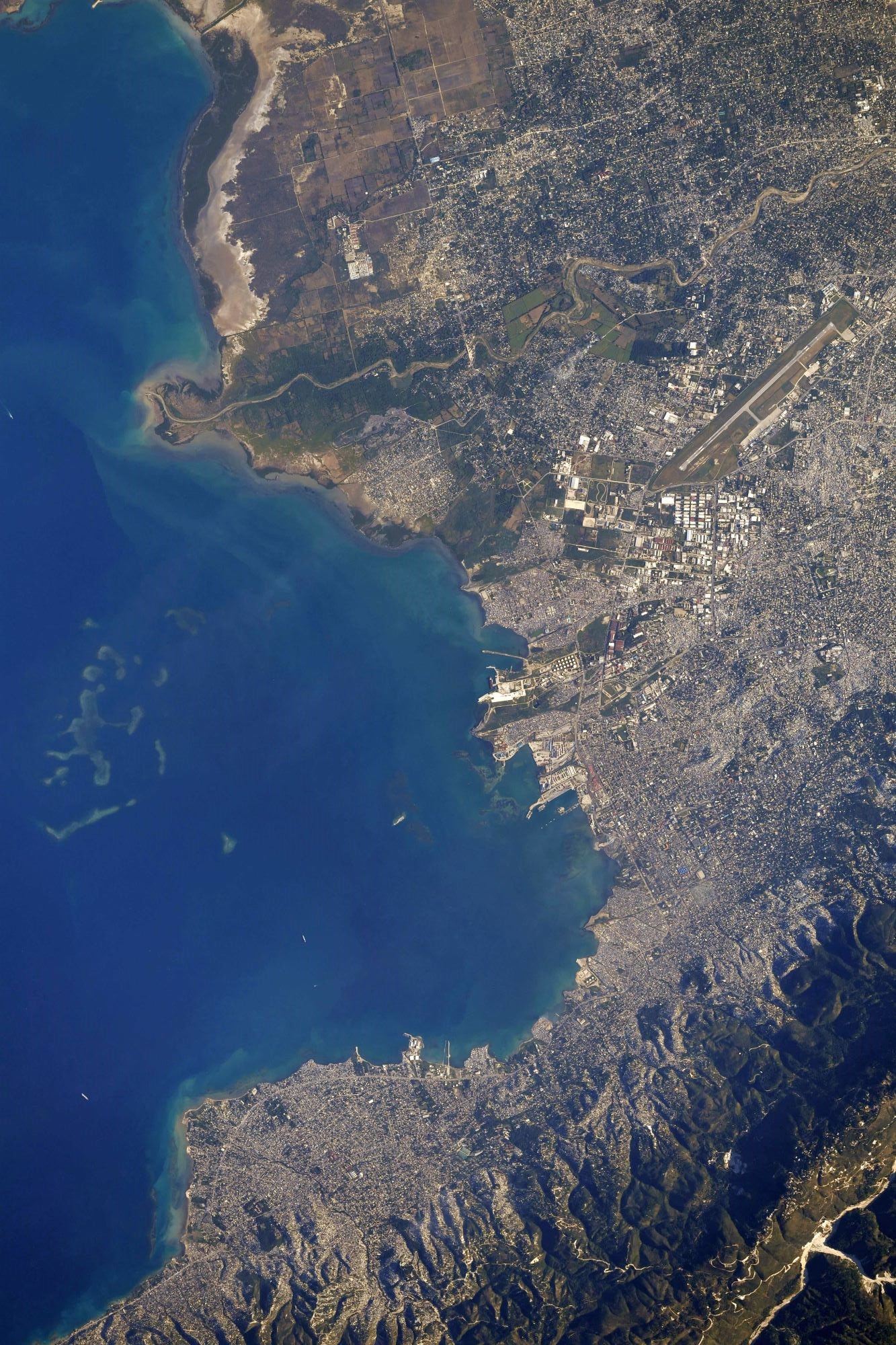 The city of Port-au-Prince is on the Gulf of Gonâve: the bay on which the city lies, which acts as a natural harbor, has sustained economic activity since the civilizations of the Taíno. It was first incorporated under French colonial rule in 1749. Recent estimates place the metropolitan area’s population at around 3.7 million, nearly half of the country’s national population. The capital exports its most widely consumed produce of coffee and sugar, and has, in the past, exported other goods, such as shoes and baseballs. Port-au-Prince has food-processing plants as well as soap, textile and cement factories. Despite political unrest, the city also relies on the tourism industry and construction companies to move its economy. (Credit: Shane Kimbrough, NASA)