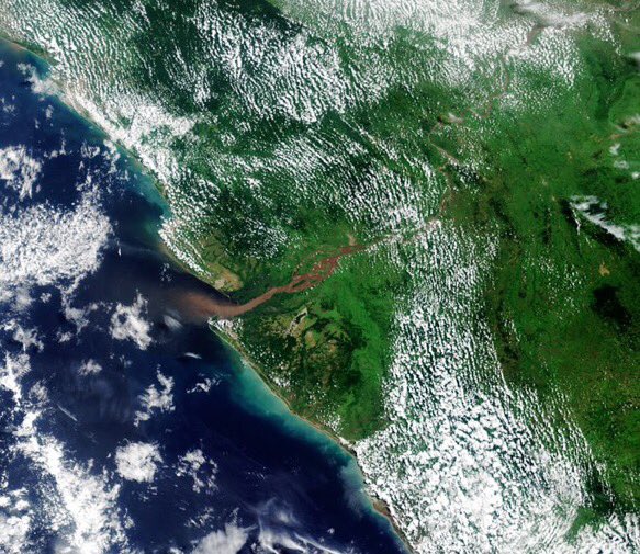EU’s Sentinel3 satellite captured Congo River. The satellite image is at the mouth of the river on the Atlantic Ocean, just in between the Democratic Republic of Congo and Angola. The sediment of the river is pushed out to the sea.