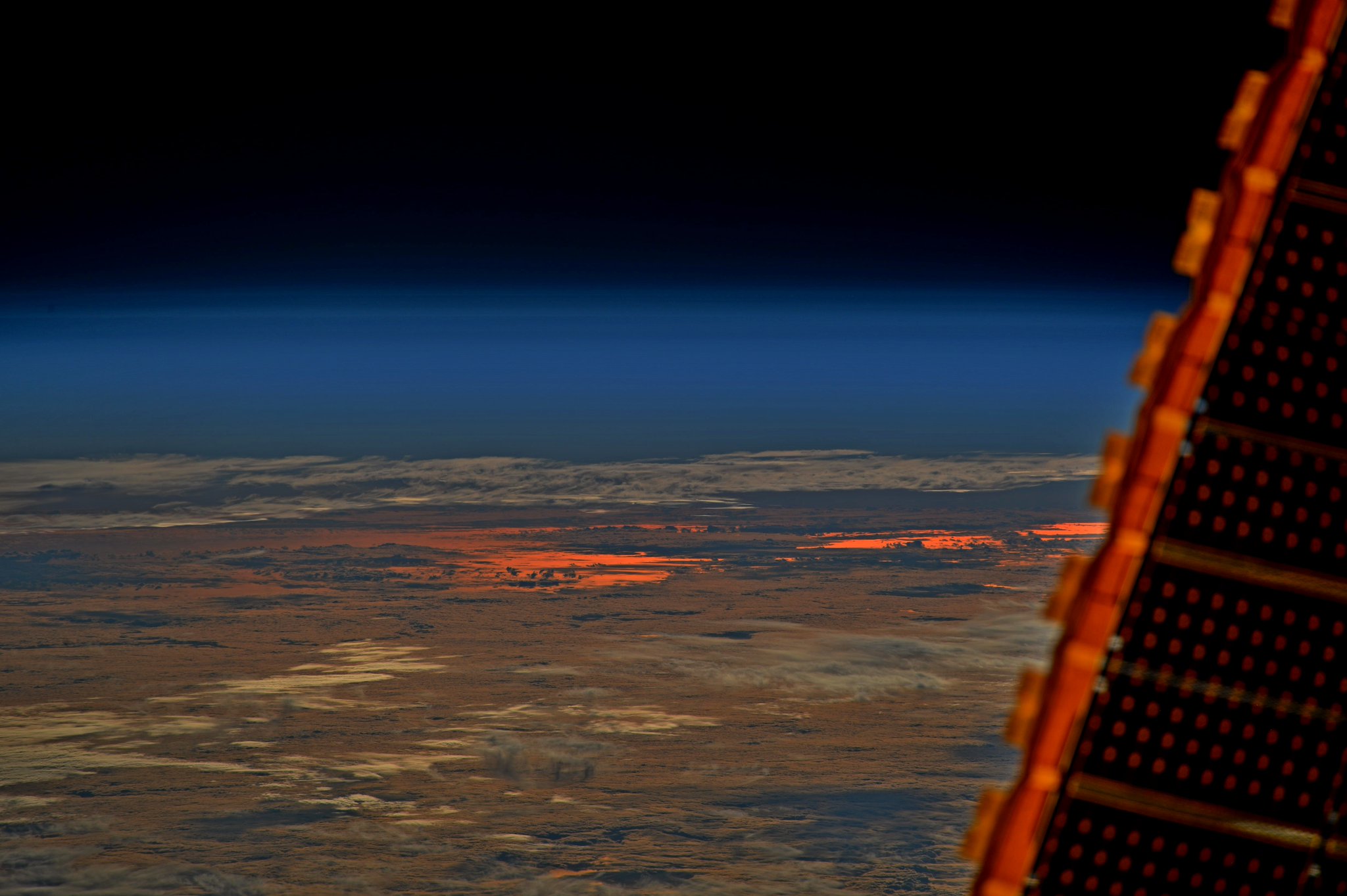 [:ja]ジャック・フィッシャー宇宙飛行士がISSから撮影した地球の夕焼けです。大気の層の下方の海面に反射する朱色の夕焼けがなんとも言えません。
