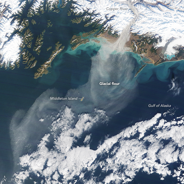Much of the dust is comprised of “glacial flour” or “rock flour” — a silty powder with grains finer than sand. While coastal waters in this part of Alaska have relatively high levels of iron, the micronutrient tends to be in short supply in deeper waters in the middle of the Gulf of Alaska. Soluble iron is an essential nutrient in marine ecosystems because phytoplankton—which sit at the center of marine food webs—depend on it to develop.