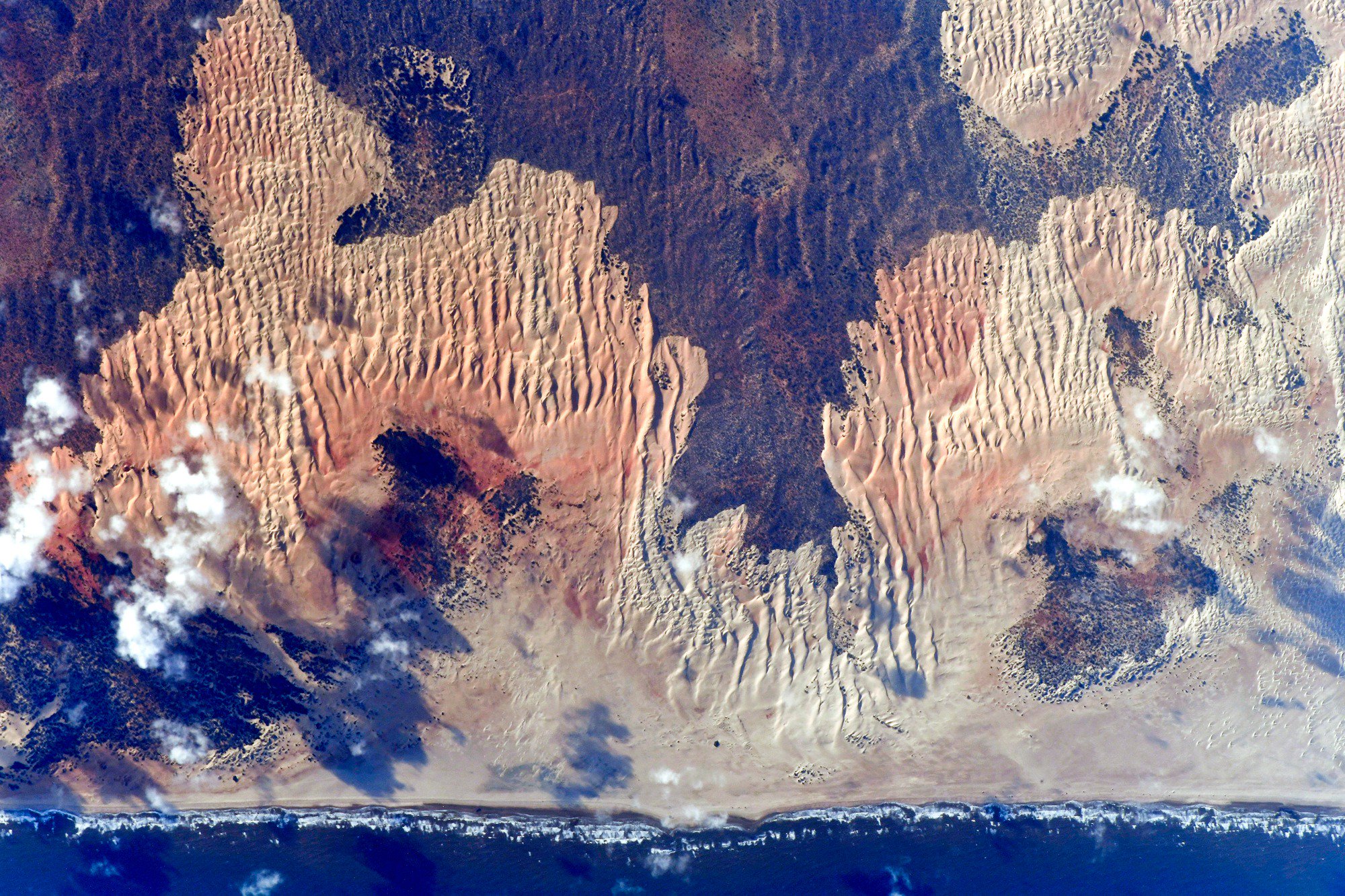 Astronaut Sergey Ryazansky captured from ISS the coast south of capital, Mogadishu, Somalia. The brown part of the image shows rocks and the yellow sands expand to the ocean.