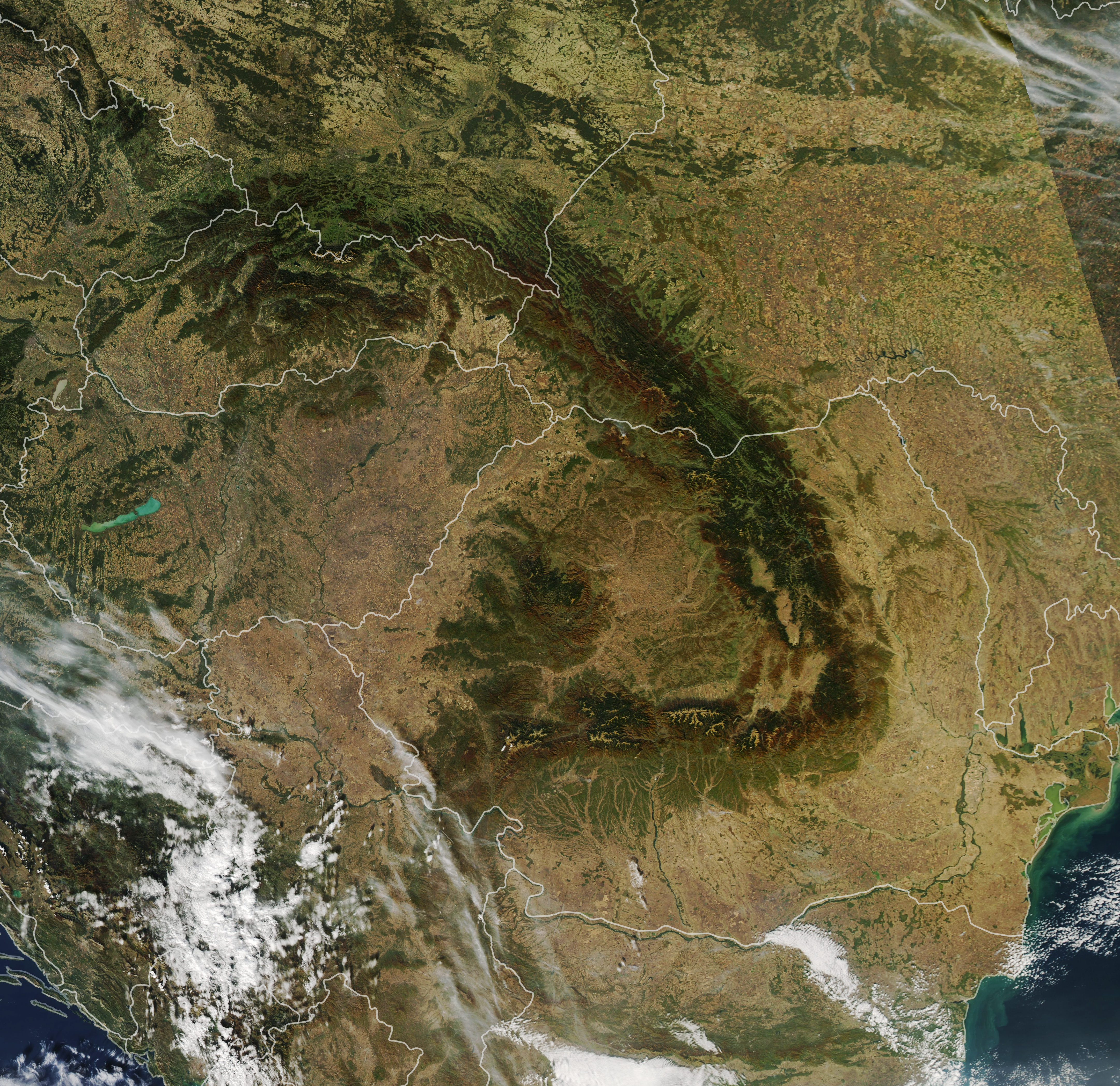 [:ja]NASAの地球観測衛星Aquaが撮影した東ヨーロッパのカルパティア山脈の秋です。山脈の上部で紅葉が始まりました。