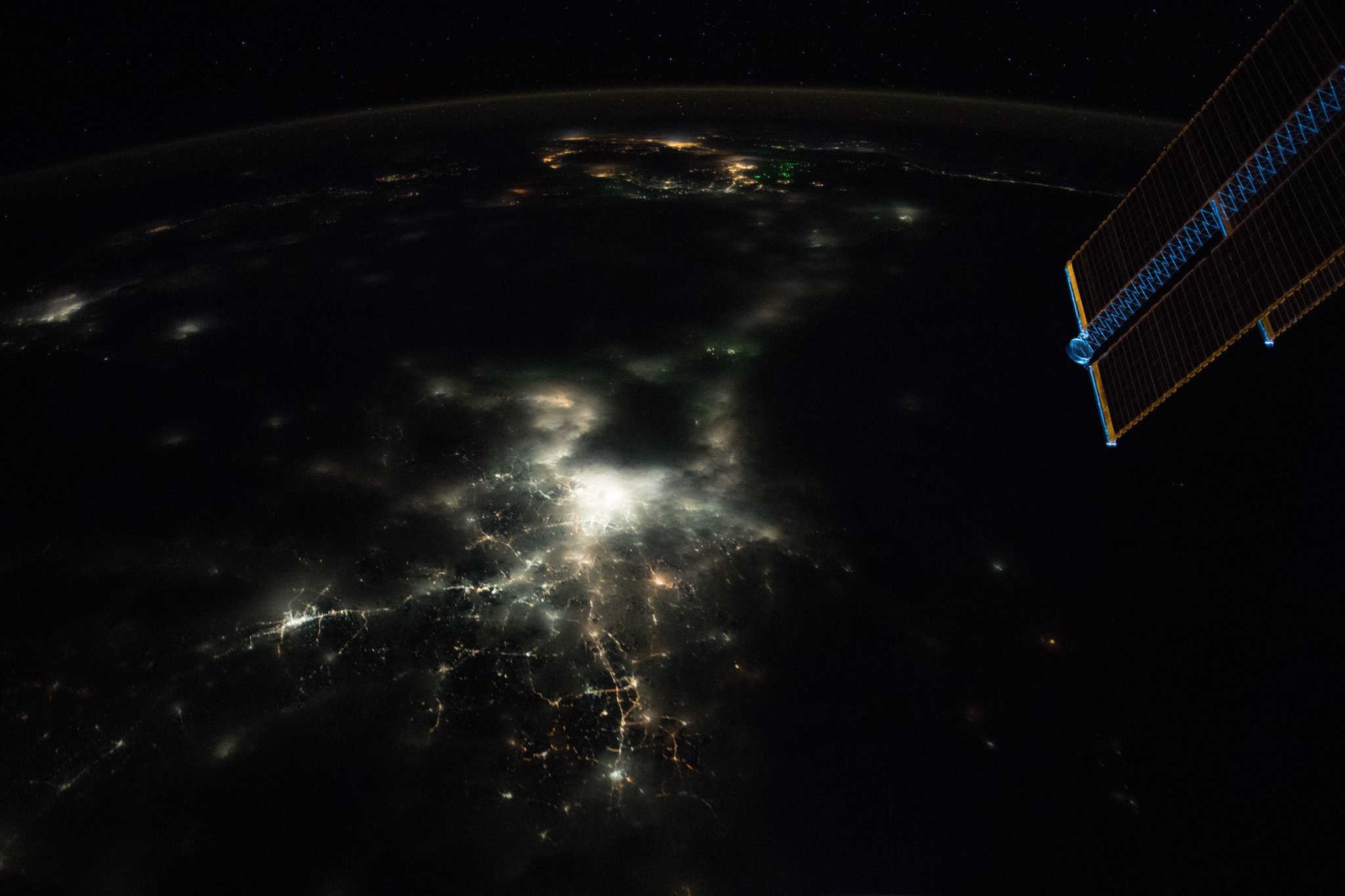 Astronaut Alex Gerst captured from ISS the nightview of Nakhon Sawan. Thailand. Green lights in the distance are squid fishing.