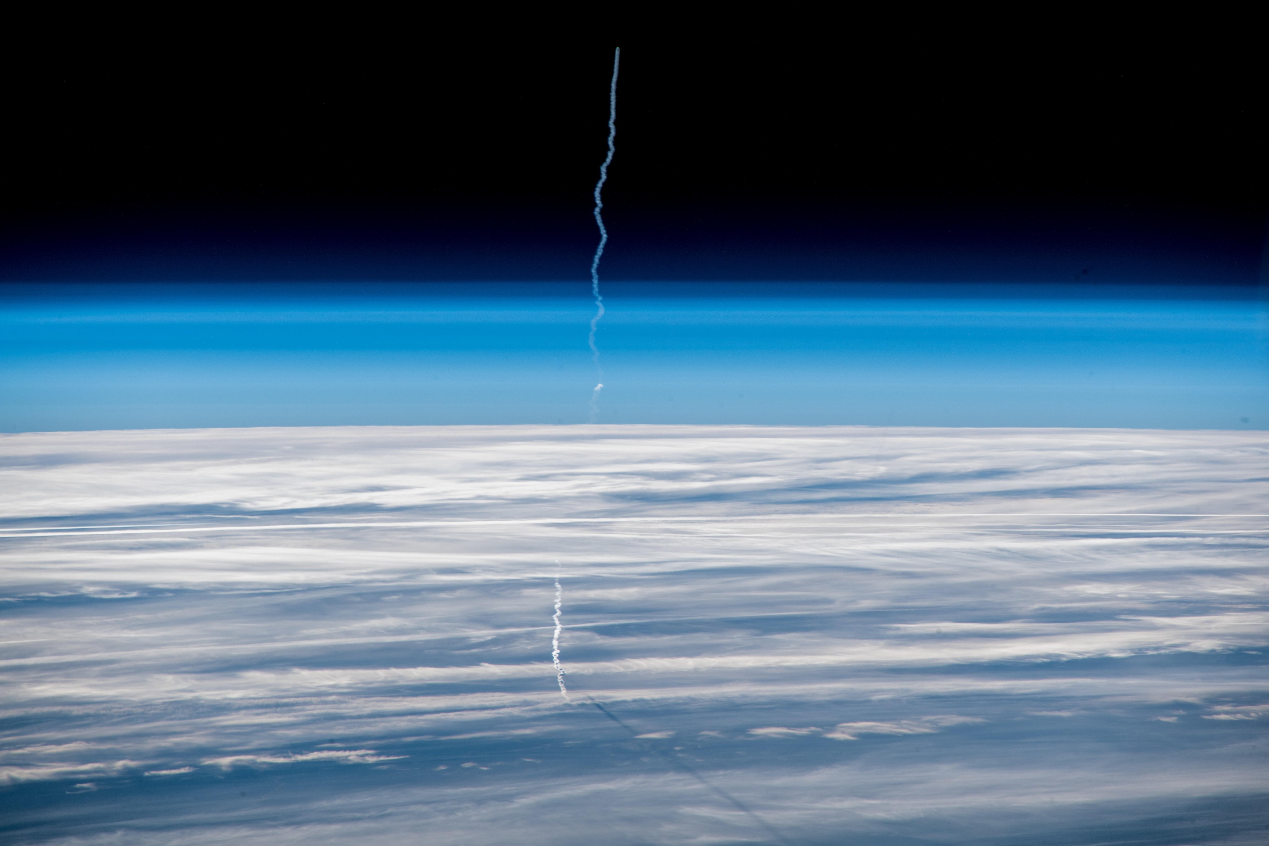 Astronaut Alex Gerst captured from ISS the Russian Soyuz launch. It is interesting to note rocket’s plume casts a ray of shadow over clouds.