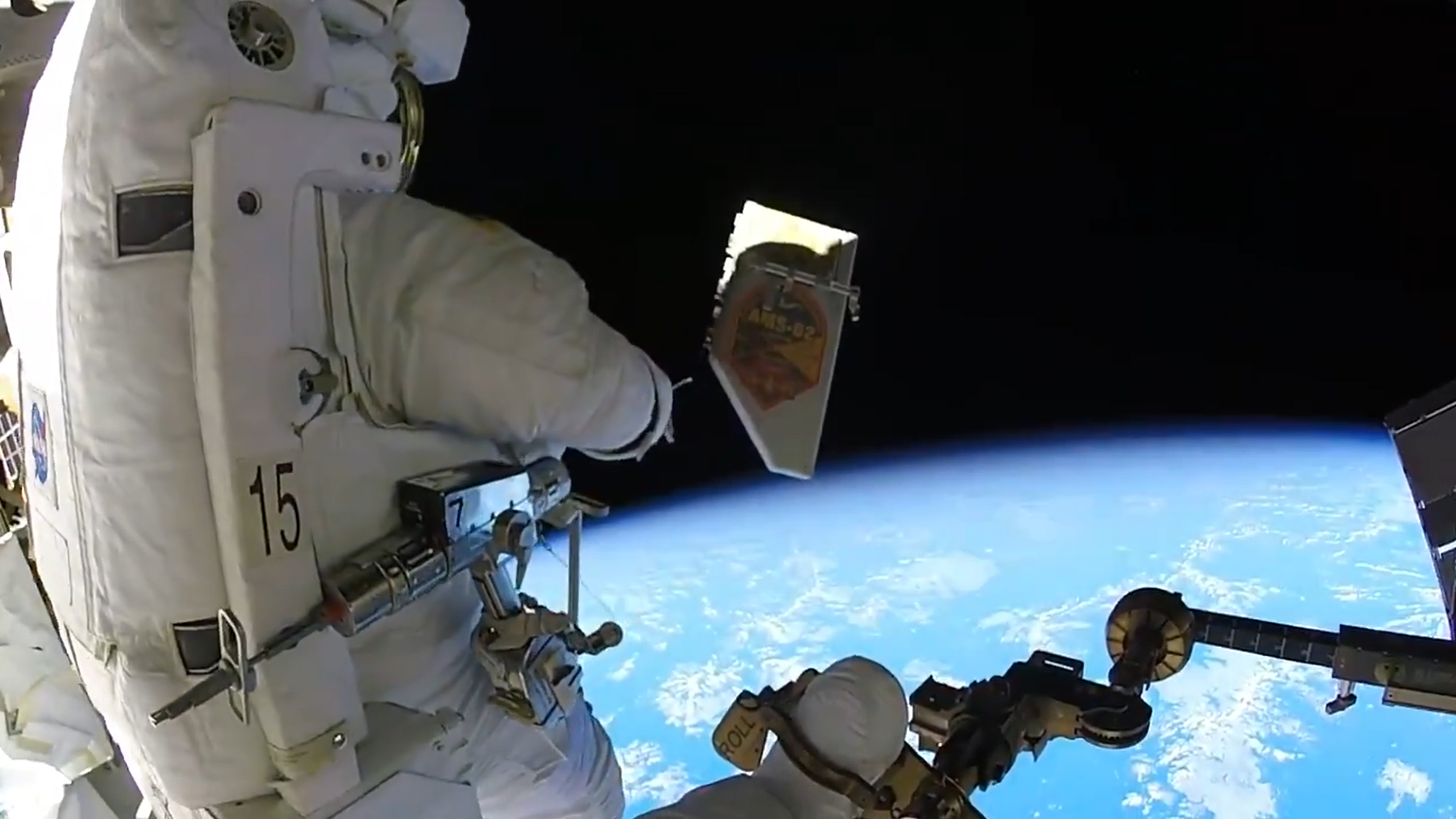 On the 1st AMS repair spacewalk, @astro_luca & I removed a debris shield to access the work site. It was too big to take inside so the best option was to jettison it behind @Space_Station where it'll eventually disintegrate in the upper atmosphere. Something we rarely need to do! pic.twitter.com/fotzjzVgRQ