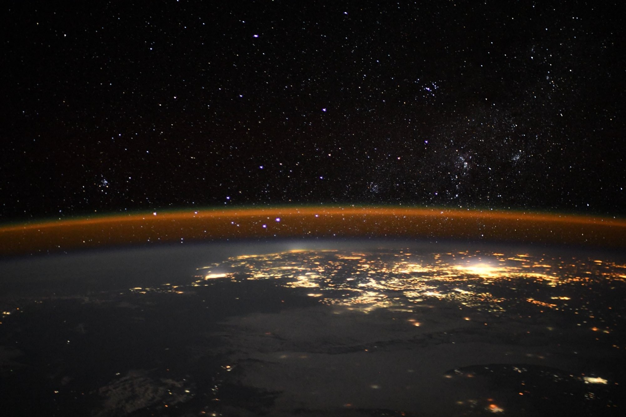 トマ・ペスケ宇宙飛行士がISSから撮影した大気光です。大気光とは、大気光学現象の一種で、地球などの惑星の大気が起こす弱い発光です。以下のような理由で、大気上層において大気光は様々な反応によって発生します。