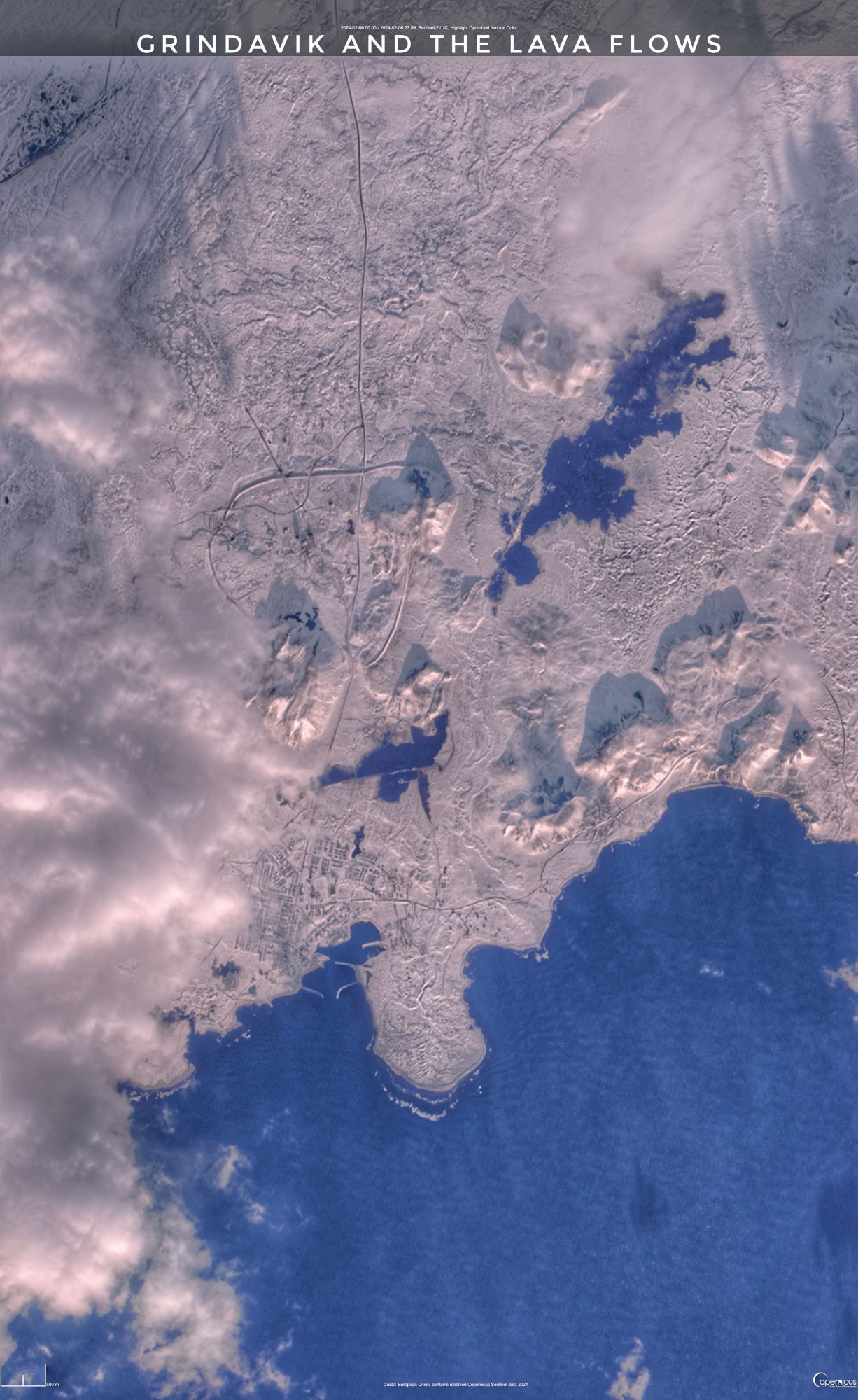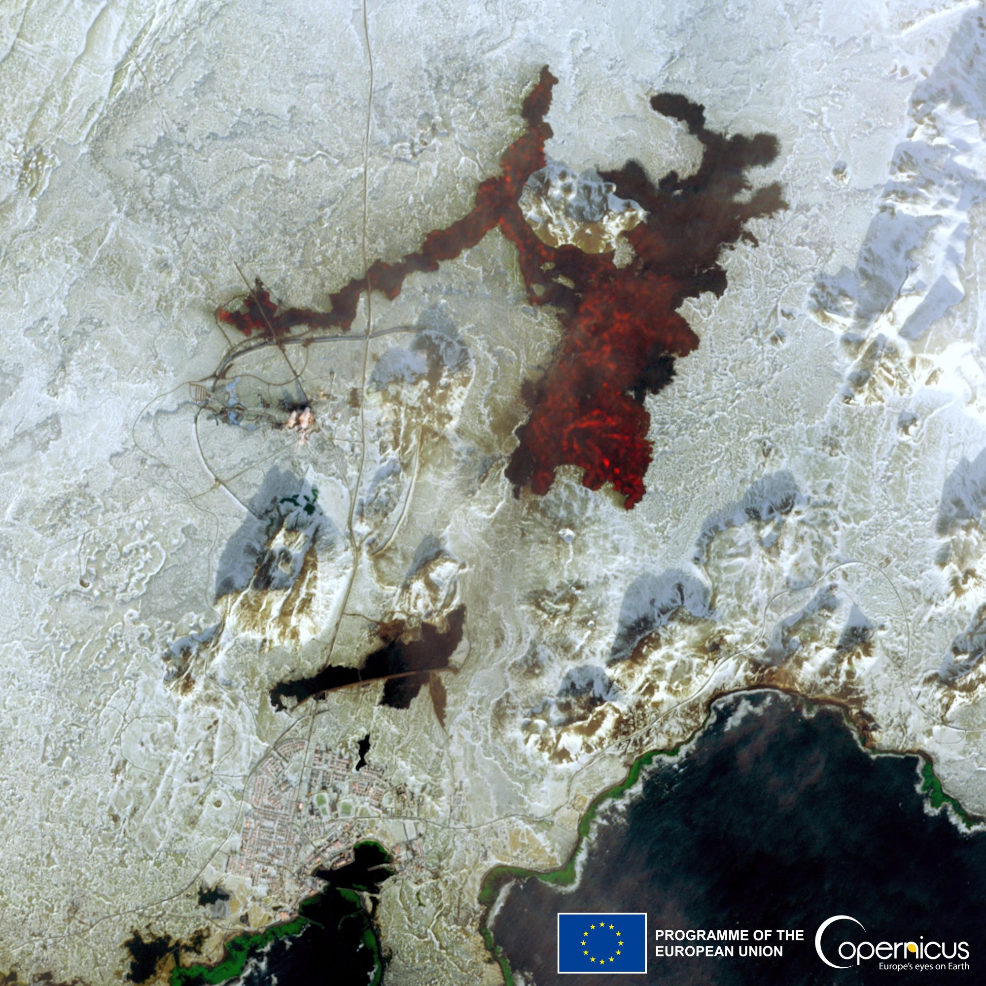 ESA’s Copernicus Sentinel-2 captured the volcanic lava flowing from a volcano near Grindavik, Iceland. Lava has reached Grindavik town but has stopped.