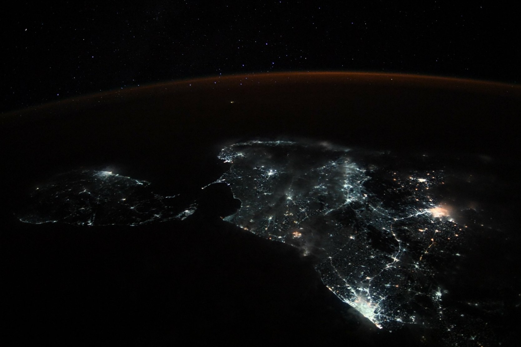 ボブ・ベーンケン宇宙飛行士がISSから撮影した南インドとスリランカの夜景です。バンガロール、チェンナイ、マドゥライや、ポーク海峡を隔ててスリランカのコロンボも写っています。