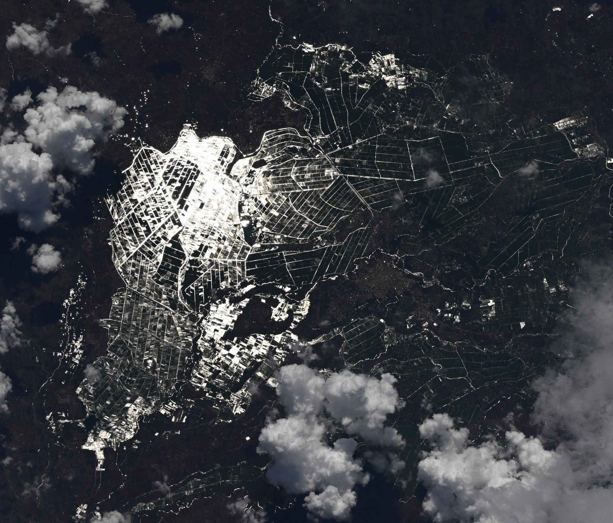 ドナルド・ペティ宇宙飛行士がISSから撮影した洪水後の畑でサングリントが起こっている様子です。サングリントは太陽光が穏やかな海面で反射した時に形成される現象で、太陽光が水面に対しほぼ鉛直に反射する鏡面反射が起こっています。